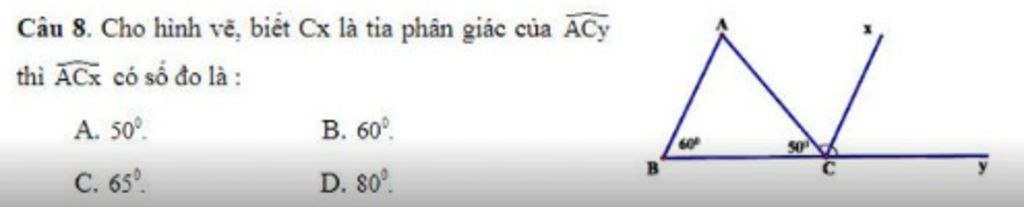 ˆ A C B + ˆ A C y = 180 o ( 2 góc kề bù ) ⇒ ˆ A C y = 180 o − 50 o = 130 o Vì C x là tia phân giác ˆ A C y ⇒ ˆ A C x = ˆ A C y : 2 = 130 o : 2 = 65 o ⇒ Đáp án đúng là : C .