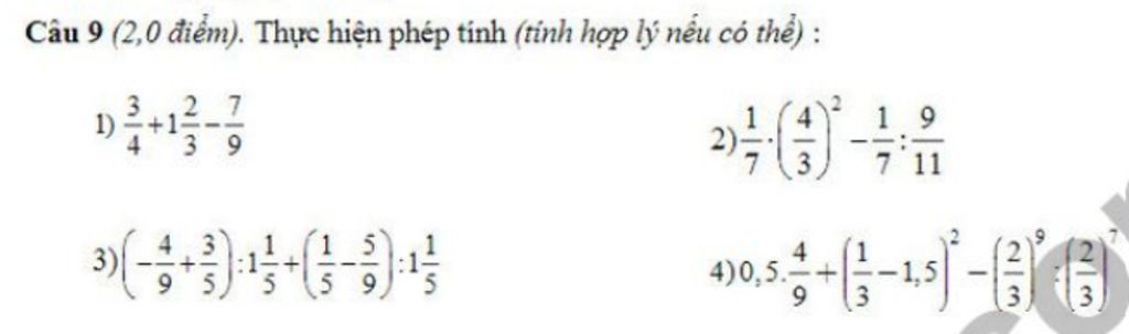 4, `0,5 . 4/9 + (1/3 - 1,5)^2 - (2/3)^9 : (2/3)^7`