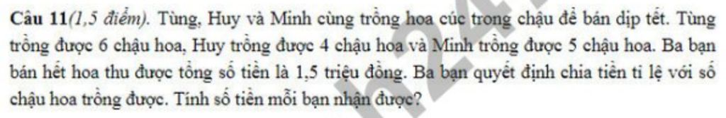 Vậy số tiền mỗi bạn nhận được là: bạn Tùng `600` nghìn đồng, bạn Huy `400` nghìn đồng, bạn Minh `500` nghìn đồng.