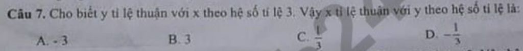 Vậy `x` tỉ lệ thuận với `y` theo hệ số tỉ lệ là `1/3`