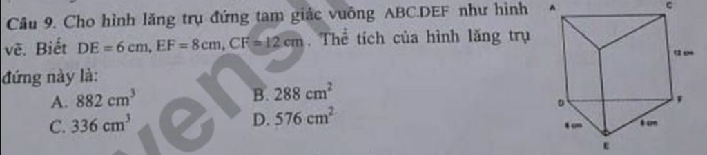 Câu 9. Cho hình lăng trụ đứng tam giác vuông ABCDEF như hình vẽ. Biết DE = 6 cm, EF = 8cm, CF = 12cm. Thể tích của hình lăng trụ đứng này là: