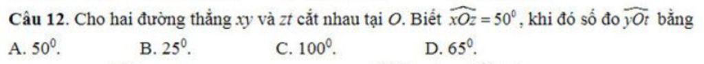 `\hat{xOz}` đối đỉnh với `\hat{yOt}` nên `\hat{yOt}=50^o`