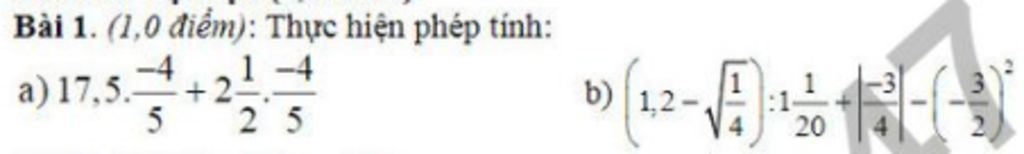 `b)` `(1,2-sqrt{1/4}):1(1)/20+|-3/4|-(-3/2)^2`