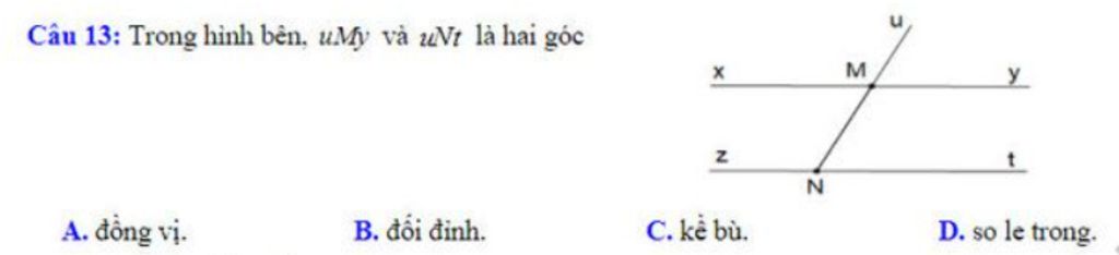 `\hat{uMy}` và `\hat{uNt}` là hai góc đồng vị.