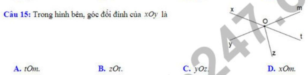 `=>` Góc đối đỉnh của `xOy` là: `tOm`