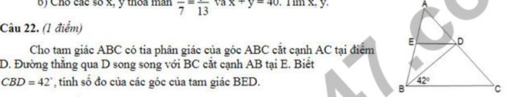 Câu 22. (1 điểm) Cho tam giác ABC có tia phân giác của góc ABC cắt cạnh AC tại điểm D. Đường thẳng qua D song song với BC cắt cạnh AB tại E. Biết CBD = $42^o$, tính số đo của các góc của tam giác BED.