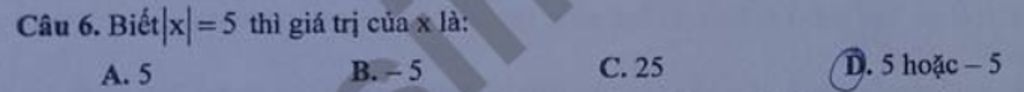 Biết `|x|=5` thì giá trị của `x` là : `x=5` hoặc `x=-5`
