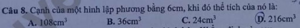 `@` Áp dụng: `V` hình lập phương `=a.a.a` (trong đó `V` là thể tích và `a` là cạnh của hình lập phương)