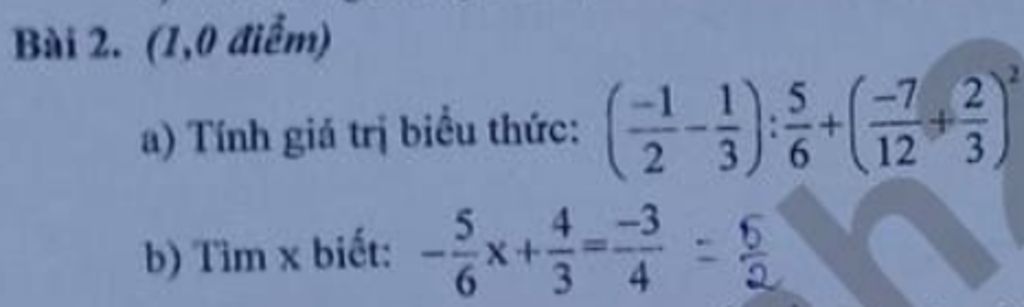 `a . ` `((-1)/2-1/3):5/6+((-7)/12+2/3)^2`