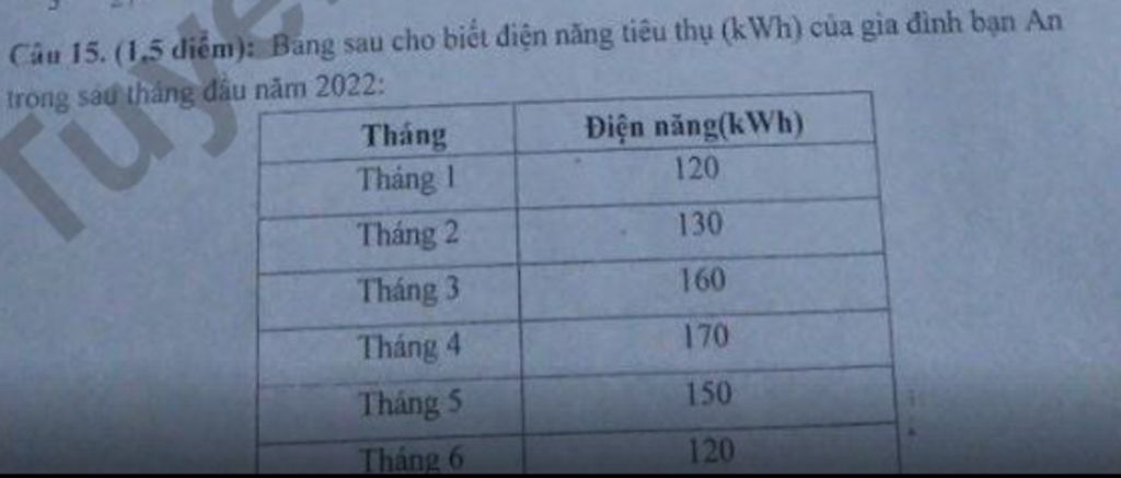 Câu 15. (1,5 điểm): Bảng sau cho biết điện năng tiêu thụ (kWh) của gia đình bạn An trong sáu tháng đầu năm 2022: