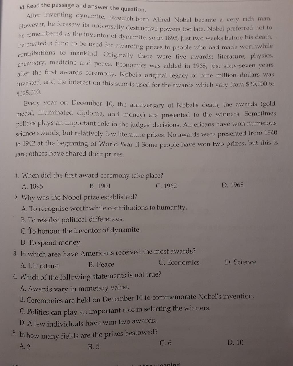 Câu 5 B ( Nobel's original legacy.......... $125,000)