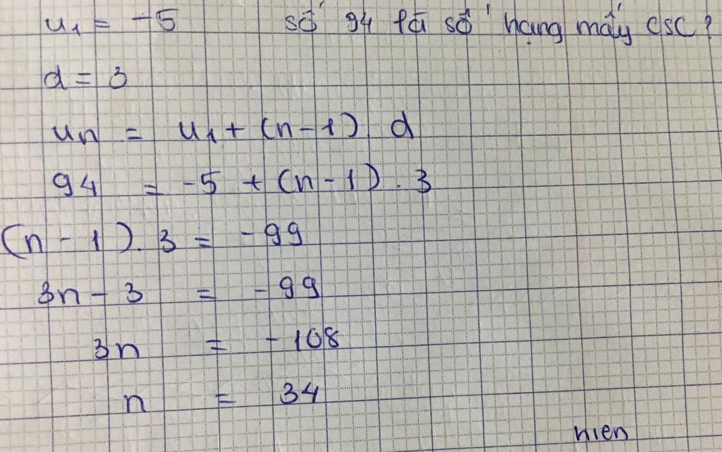 Cho cấp số cộng (Un) có số hạng đầu u1=5 và công sai d=3. Số hạng 94 là số hạng thứ mấy của cấp số cộng