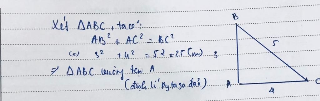 Ta có:`AB=3=>AB^2=3^2``AC=4=>AC^2=4^2``=>AB^2+AC^2=3^2+4^2=9+16=25`Mà: `BC^2=25``=>AB^2+AC^2=BC^2`Theo định lý pytago đảo `=>` tam giác `ABC` vuông tại A