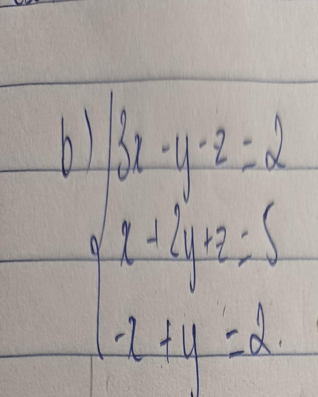 `{(3x-y-z=2),(x+2y+z=5),(-x+y=2):}`