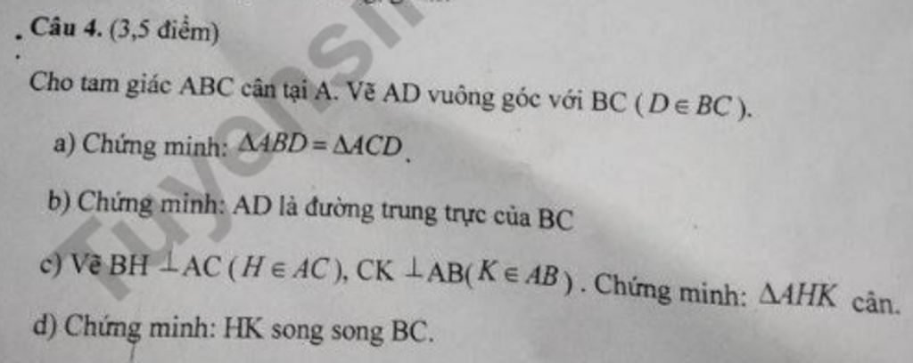 Câu 4. (3,5 điểm) Cho tam giác ABC cân tại A. Vẽ AD vuông góc với BC (D ∈ BC ).
