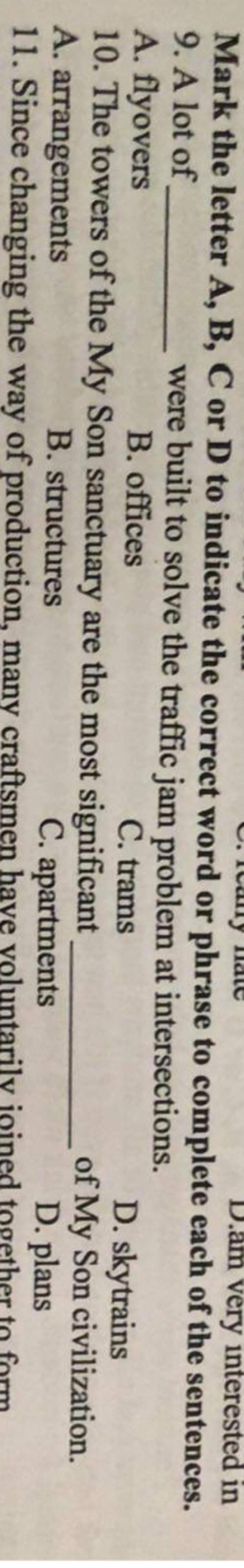 - office (n) : văn phòng ; tram (n) : xe điện ; skytrain (n) : tàu trên không trung