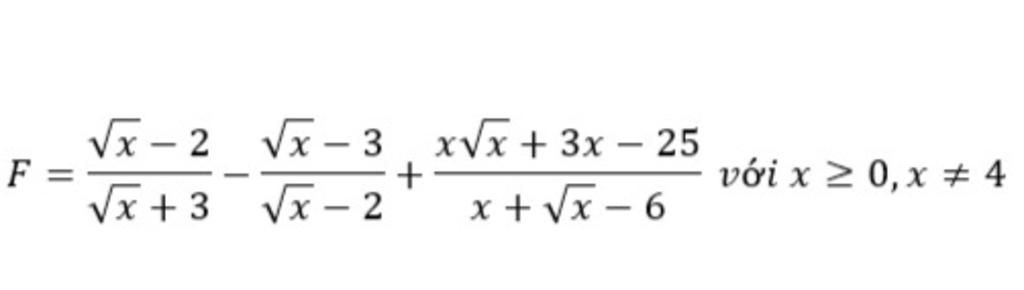 `P = (sqrt(x) - 2)/(sqrt(x) + 3) - (sqrt(x) - 3)/(sqrt(x) - 2) + (x * sqrt(x) + 3x - 25)/(x + sqrt(x) - 6)= (sqrt(x) - 2)/(sqrt(x) + 3) - (sqrt(x) - 3)/(sqrt(x) - 2)+(x * sqrt(x) + 3x - 25)/((sqrt(x) + 3)(sqrt(x) - 2))= (x - 4sqrt(x) + 4 - x + 6sqrt(x) - 9 + x * sqrt(x) + 3x - 25)/((sqrt(x) + 3)(sqrt(x) - 2))= (x * sqrt(x) + 2sqrt(x) + 3x - 30)/((sqrt(x) + 3)(sqrt(x) - 2))`