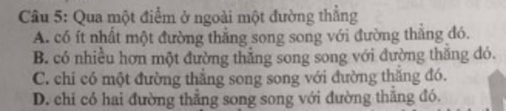 `@` Tiên đề Euclid (Ơ-cờ-lít): Qua một điểm ở ngoài một đường thẳng, chỉ có một đường thẳng song song với đường thẳng đó.