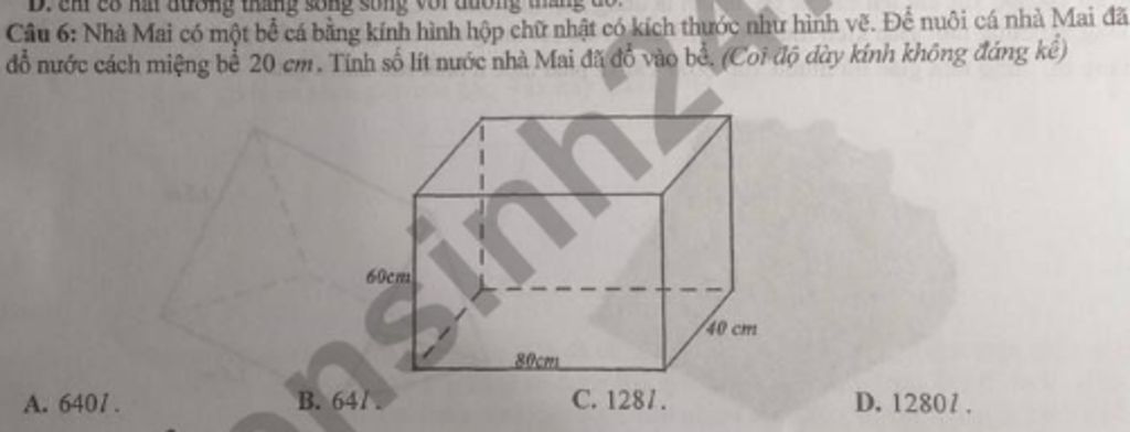 `80 xx 40 xx (60 - 20) = 128000(cm^3) 128dm^3 = 128l`