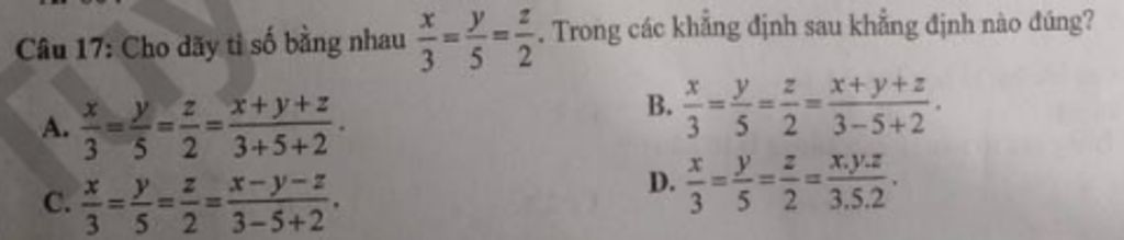 `x/3=y/5=z/2=(x+y+z)/(3+5+2)` ( Dấu trên tử và mẫu giống nhau )