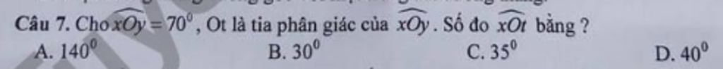 $\bullet$ Do `Ot` là tia phân giác của `\hat{xOy}=>\hat{xOt}=\hat{yOt}=1/2\hat{xOy}=1/2 . 70^o =35^o`