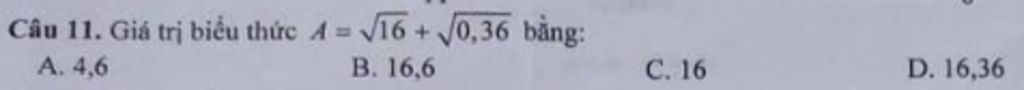 `A=sqrt{16}+sqrt{0,36}`