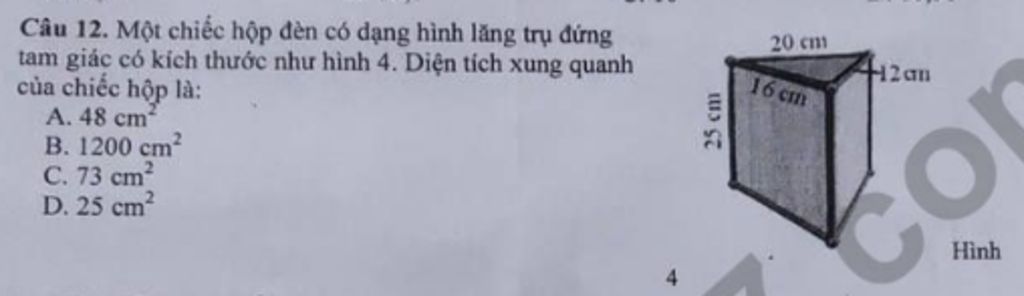 Vậy diện tích xung quanh của chiếc hộp đèn hình lăng trụ đứng tam giác đó là `1200cm^2`