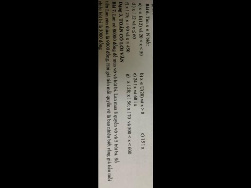Bài 7. Lan có 80000 đồng để mua vở và bút bi. Lan mua 8 quyển vở và 5 bút bị. Số