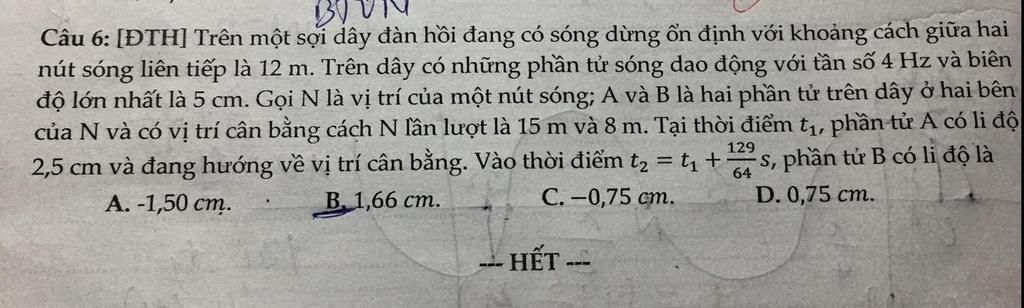 Câu 6: [ĐTH] Trên một sợi dây đàn hồi đang có sóng dừng ổn định với khoảng cách giữa hai
