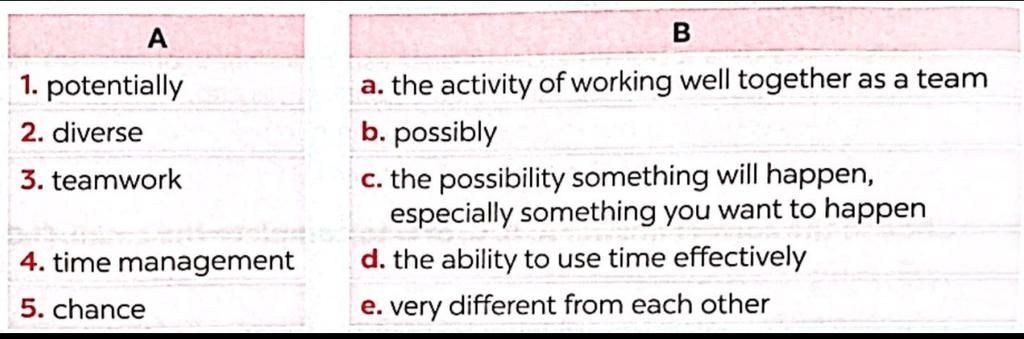 a. Match a word / phrase in A with its meaning in B. Ghi chú cách làm bài: Điền a, b, c, d hoặc e vào ô trống tương ứng.