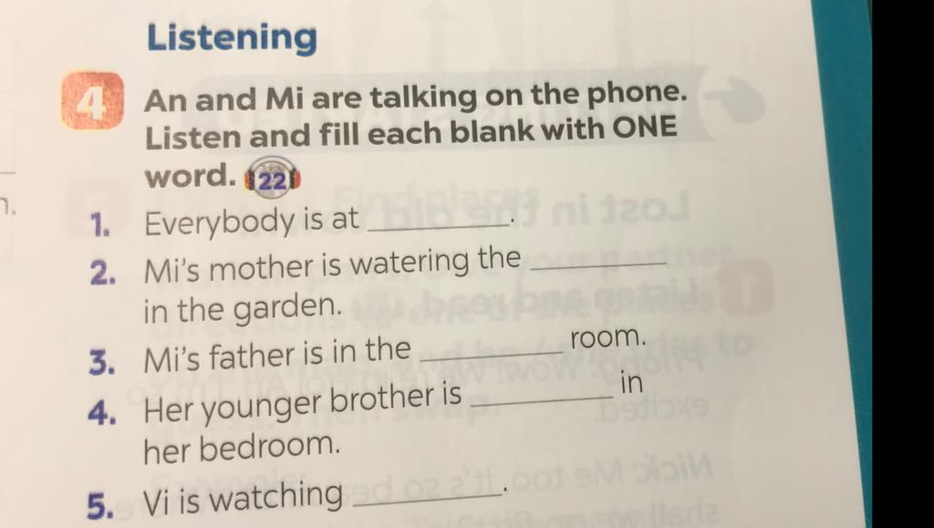 Mi: No. He’s $\text{sleeping}$ in my bedroom. My cousin, Vi, is here too.