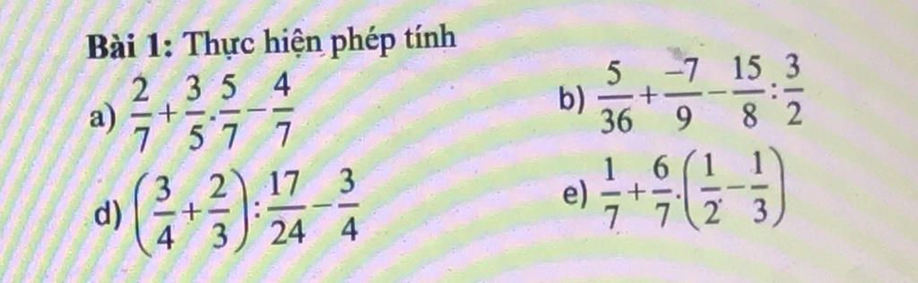 `e)` `1/7 + 6/7 . ( 1/2 - 1/3 )`