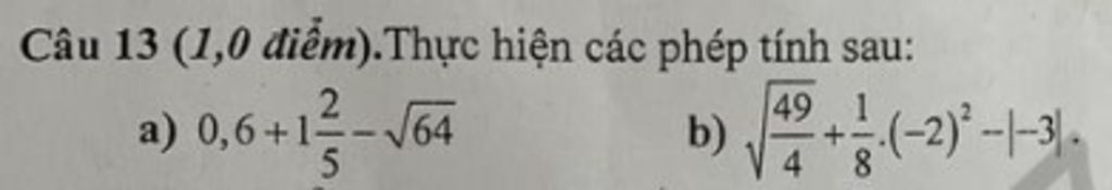 a) `0,6 + 1` $\dfrac{2}{5}$ `-` $\sqrt{64}$