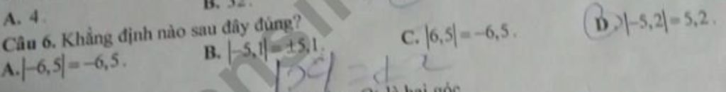 Đáp án `A` sai vì: `|-6,5|=-(-6,5)=6,5`