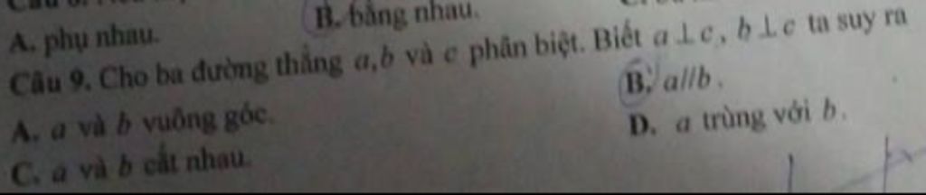 Do đó : `a⊥c` và `b⊥c` với `a;b;c` phân biệt `=>` $a//b$