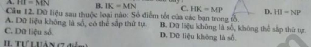 Câu 12. Dữ liệu sau thuộc loại nào: Số điểm tốt của các bạn trong tố.
