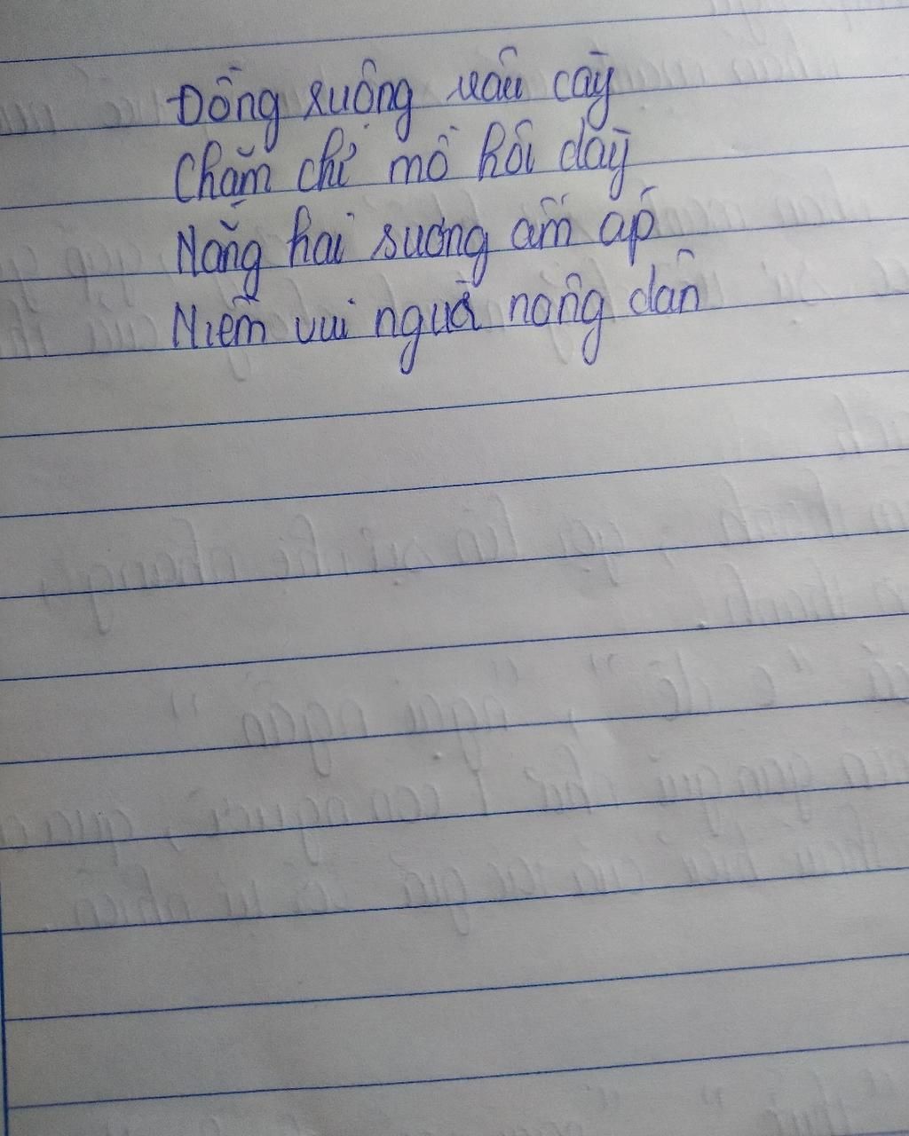 Mọi người giúp mik viết thêm 2 khổ thơ nữa với. Đề tài là người nông dân . Thể thơ là thơ 4 chữ hoặc 5 chữ ạ