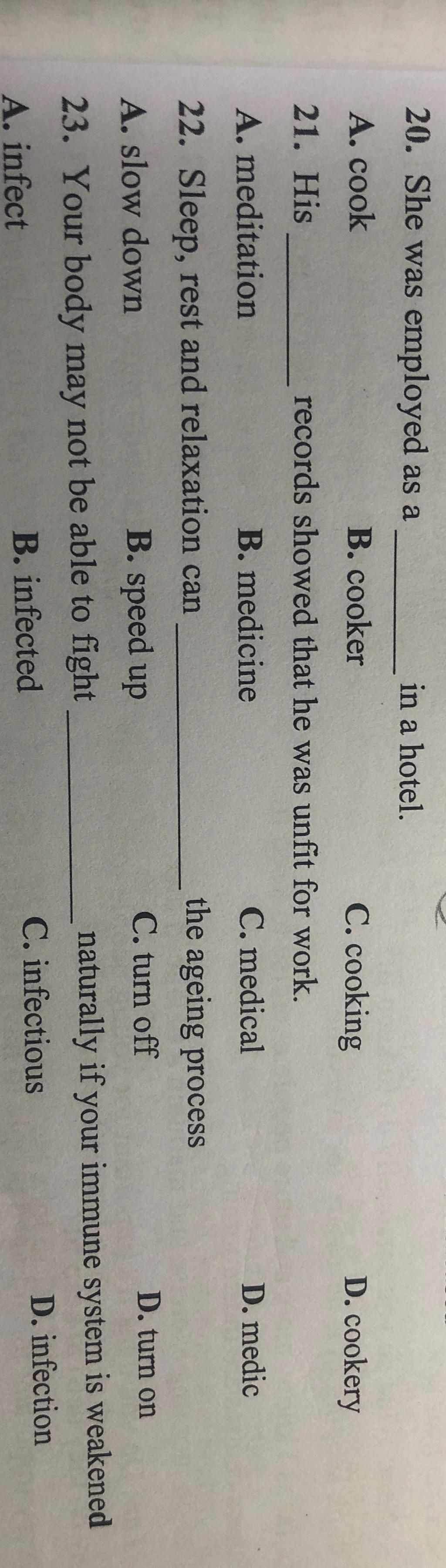 23. D (n) sự nhiễm trùng (Cơ thể bạn có thể không chống lại nhiễm một cách tự nhiên nếu hệ thống miễn dịch của bạn bị suy thoái)