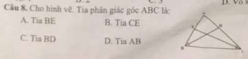 `\hat{ABD}` `=` `\hat{CBD}` `=>` `BD` là tia phân giác của `\hat{ABC}`
