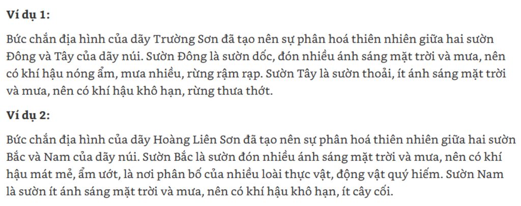 Lấy 2 ví dụ về vai trò của bức chắn địa hình tạo nên sự phán hoá thiên nhiên giữa các sườn núi