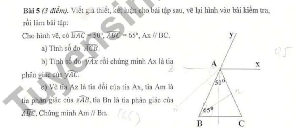 c) Vẽ tia Az là tia đối của tia Ax, tia Am là tia phân giác của $\widehat{zAB}$, tia Bn là tia phân giác của $\widehat{ABC}$. Chứng minh Am // Bn.