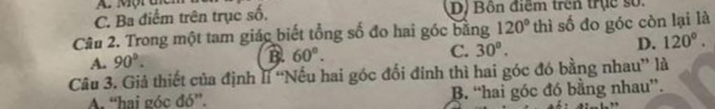 Câu 2. Trong một tam giác biết tổng số đo hai góc bằng 120° thì số đo góc còn lại là