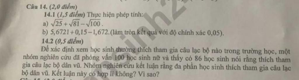 Kết luận đó hợp lí bởi số học sinh thích tham gia câu lạc bộ dân vũ chiếm hơn một nửa số học sinh đã phỏng vấn (`86/100 xx 10% = 86% > 50%`)