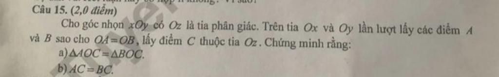 Câu 15. (2,0 điểm) Cho góc nhọn xOy có Oz là tia phân giác. Trên tia Ox và Oy lần lượt lấy các điểm d và B sao cho OA=OB, lấy điểm C thuộc tia Oz . Chứng minh rằng: