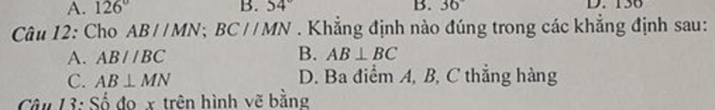 Do $AB//MN$ và $BC//MN$, mà đoạn thẳng `AB` và `BC` có chung đầu mút là điểm `C`