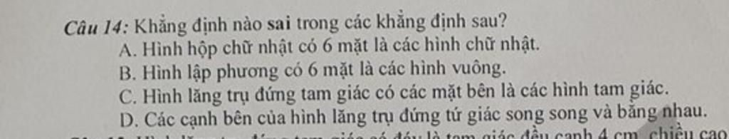 `C.` Hình lăng trụ đứng tam giác có các mặt bên là các hình tam giác `->` Sai vì các mặt bên của hình lăng trụ đứng tứ giác là hình chữ nhật