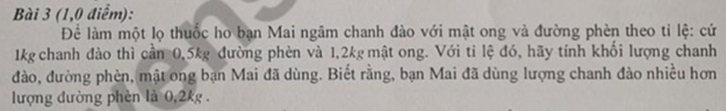 Bài 3 (1,0 điểm): Để làm một lọ thuốc ho bạn Mai ngâm chanh đào với mật ong và đường phèn theo tỉ lệ: cứ 1kg chanh đào thì cần 0,5kg đường phèn và 1,2kg mật ong. Với tỉ lệ đó, hãy tính khối lượng chanh đào, đường phèn, mật ong bạn Mai đã dùng. Biết rằng, bạn Mai đã dùng lượng chanh đào nhiều hơn lượng đường phèn là 0,2kg .