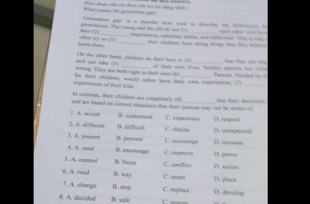 generations. The young and the old do not (0) experiences, opinions, habits, and behavi offen try to (3) their children the doing things their (2)