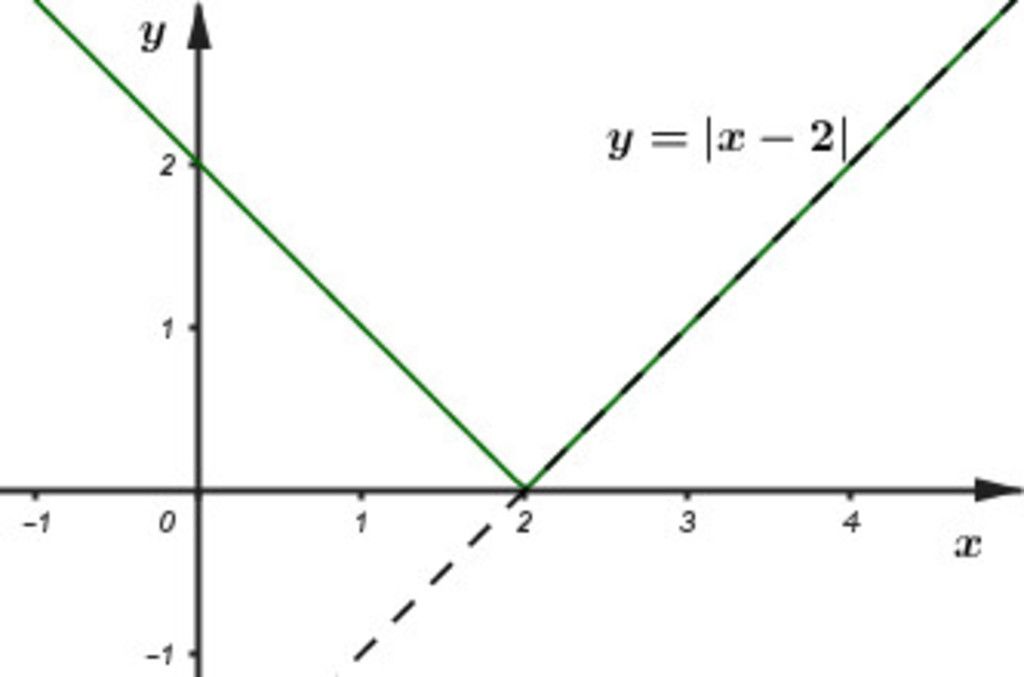 Giữ lại phần đồ thị hàm số \(y=x-2\) ở phía trên trục Ox và lấy đối xứng phần đồ thị phía dưới trục Ox lên phía trên ta được đồ thị hàm số \(y=|x-2|.\)