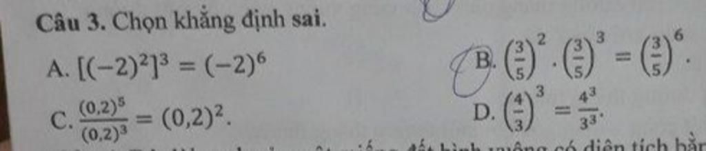 `B. (3/5)^2 .(3/5)^3=(3/5)^(2+3)=(3/5)^5 !=(3/5)^6->` Sai
